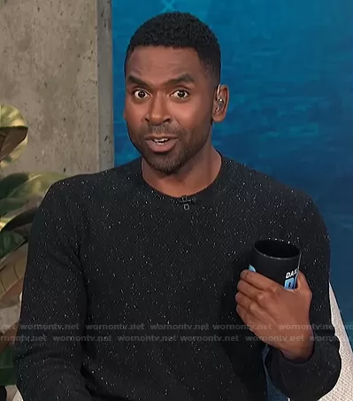 Justin Sylvester on E! News on E! was spotted wearing this black speckled textured sweater on E! News Daily Pop on Nov 17 2021's episode. Justin's Sweater is the Jules Wool Crewnek Sweater by APC.