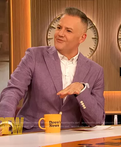 Ross Mathews on The Drew Barrymore Show on CBS was spotted wearing this purple blazer on The Drew Barrymore Show on Jan 24 2022's episode. Ross's Blazer is the Slim-Fit Lavender Linen Sport Coat by Tallia.
