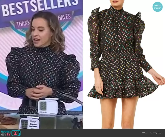 on Today on NBC was spotted wearing this metallic polka dot dress on Today on Nov 18 2021's episode. 's Dress is the Gianna Sequined Mini Dress by Misa Los Angeles.