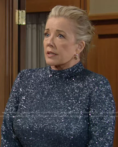 Nikki Reed Newman (played by Melody Thomas-Scott) on The Young and the Restless on CBS was spotted wearing this blue sequin top on The Young and the Restless on Nov 18 2021's episode. Nikki's Top is the Axton Sequin Blouse by Lafayette 148 NY.