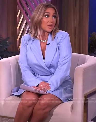 Adrienne Houghton on The Real on BETher was spotted wearing this blue pinstripe blazer on The Real on Nov 18 2021's episode. Adrienne's Blazer is the Pinstripe Oversized Longline Blazer by Boohoo.