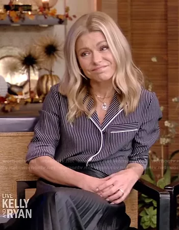 Kelly Ripa on Live with Kelly and Mark on Disney ABC Home Entertainment was spotted wearing this black striped shirt and pleated skirt on Live with Kelly and Ryan on Nov 18 2021's episode. Kelly's Top is the Luca Silk Pajama Top by Rag & Bone . Kelly's Skirt is the Pleated Faux Leather Midi Skirt by Maison Margiela.