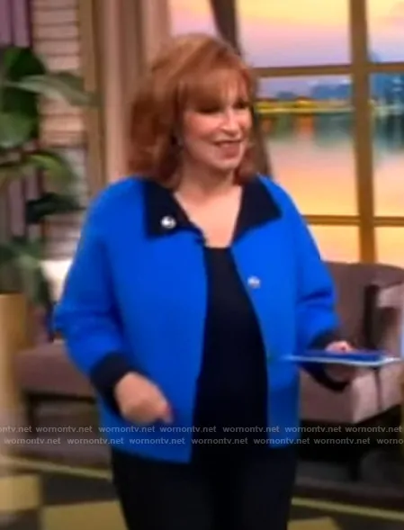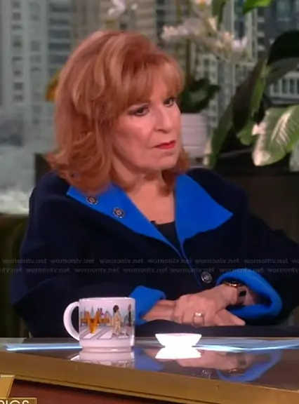 Joy Behar on The View on ABC was spotted wearing this blue two-tone jacket on The View on Jan 16 2026's episode. Joy's Coat is the Simone Reversible Wool & Cashmere Coat by Lafayette 148.