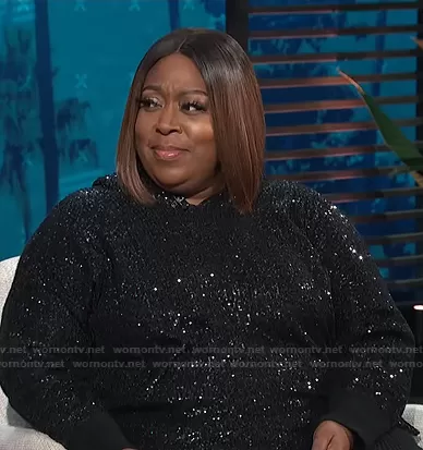 Loni Love on E! News on E! was spotted wearing this black sequin hoodie on E! News Daily Pop on Nov 19 2021's episode. Loni's Sweater is the Plus Size Sequin Sweater Hoodie by INC International Concepts.