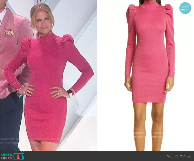 Natalie Morales on The Talk on CBS was spotted wearing this pink metallic dress on The Talk on Nov 19 2021's episode. Natalie's Dress is the Issa Turtleneck Puff-Sleeve Dress by Alice + Olivia.