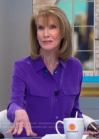 on CBS Mornings on CBS was spotted wearing this purple blouse on CBS Mornings on Nov 04 2022's episode. 's Top is the Slim Signature Silk Shirt by Equipment .