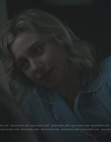 Betty Cooper (played by Lili Reinhart) on Riverdale on The CW was spotted wearing this blue printed pajamas on Riverdale on episode 'Welcome to Rivervale' (6x01) in Nov 2021. Betty's Pajamas is the Gisele Shortie Short by Eberjey.
