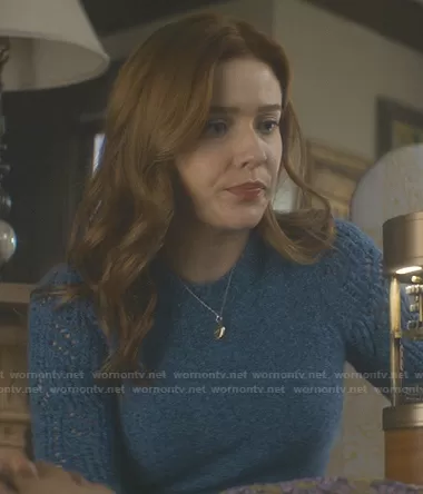 Nancy Drew (played by Kennedy McMann) on Nancy Drew on The CW was spotted wearing this blue pointelle sleeve sweater on Nancy Drew on episode 'The Gambit of the Tangled Souls' (3x07) in Nov 2021. Nancy's Sweater is the Devi Openwork Puff Sleeve Sweater by Veronica Beard.