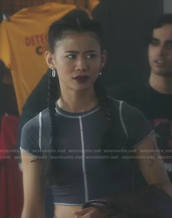 George Fan (played by Leah Lewis) on Nancy Drew on The CW was spotted wearing this grey cropped tee with white stitching on Nancy Drew on episode 'The Testimony of the Executed Man' (3x03) in Oct 2021. George's Top is the Exposed Seams Stormi Tee by Garage.