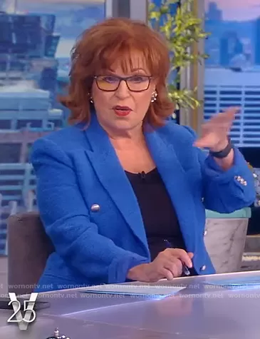 Joy Behar on The View on ABC was spotted wearing this blue double breasted blazer on The View on Nov 22 2021's episode. Joy's Jacket is the Kenzie Double-Breasted Blazer by L'Agence.