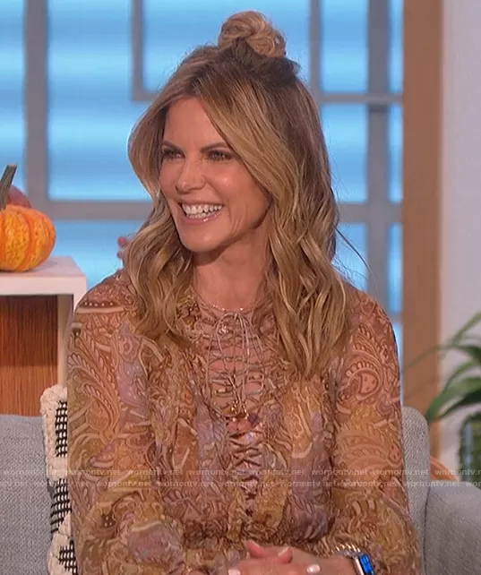 Natalie Morales on The Talk on CBS was spotted wearing this paisley print lace up front dress on The Talk on Nov 22 2021's episode. Natalie's Dress is the Concert Lace-Up Paisley Chiffon Dress by Zimmermann.