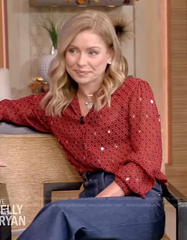 Kelly Ripa on Live with Kelly and Mark on Disney ABC Home Entertainment was spotted wearing this red geometric print blouse and jeans on Live with Kelly and Ryan on Nov 23 2021's episode. Kelly's Top is the Cabot Embellished Print Georgette Blouse Dries van Noten . Kelly's Pants is the Leather-Patch High-Rise Flared Jeans by Paco Rabanne . Kelly's Shoes is the Gianvito 105 mm Pumps by Etro x Gianvito Rossi.