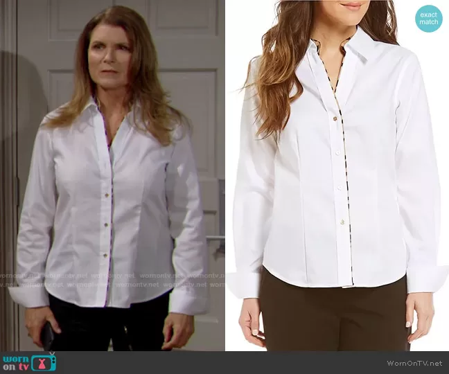 Sheila Carter (played by Kimberlin Brown) on The Bold and the Beautiful on CBS was spotted wearing this white button down shirt with leopard trim on The Bold and the Beautiful on Nov 23 2021's episode. Sheila's Top is the Oxford Top with Leopard Piping by Calvin Klein.