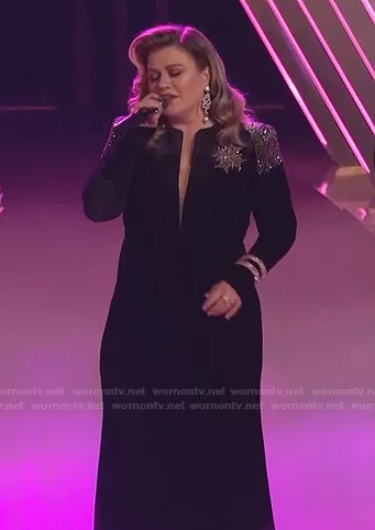 Kelly Clarkson on The Voice on NBC was spotted wearing this black velvet embellished dress on The Voice on Nov 18 2021's episode. Kelly C's Dress is the Fall Winter 2020 Collection by Giorgio Armani . Kelly C's Bracelet is the Triple Wrap Snake Bracelet by Gucci.