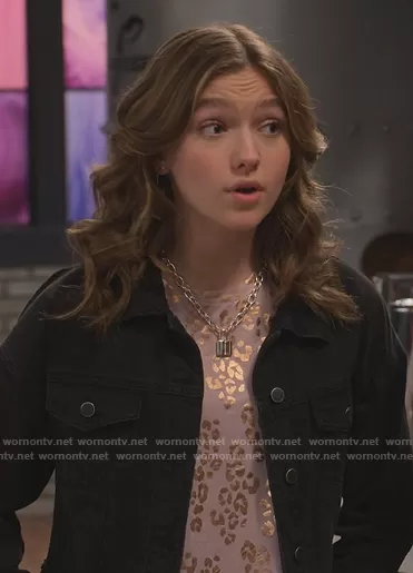 Presley (played by Jayden Bartels) on Side Hustle on Nickeldeon was spotted wearing this pink metallic leopard top and jeans on Side Hustle on episode 'Lex-Jitsu' (2x06) in Nov 2021. Presley's Top is the Active Crop Tank by Spiritual Gangster . Presley's Pants is the High-Waisted Carpenter Jean by BDG at Urban Outfitters.