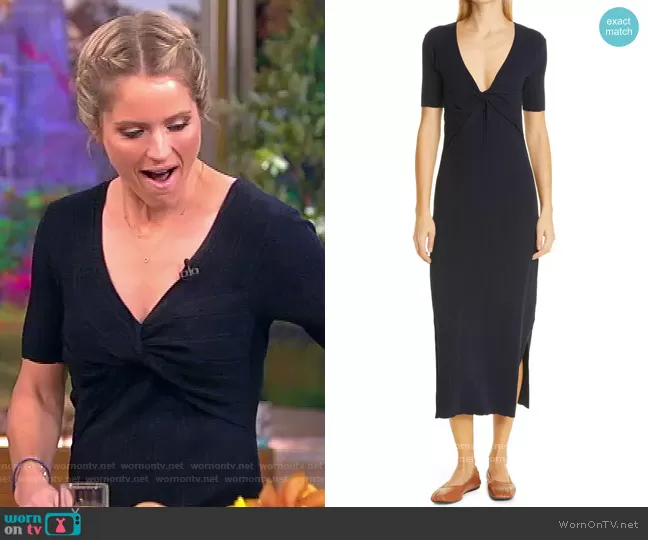 Sara Haines on The View on ABC was spotted wearing this navy twist front dress on The View on Nov 24 2021's episode. Sara's Dress is the Twist Front Sweater Dress by Frame.
