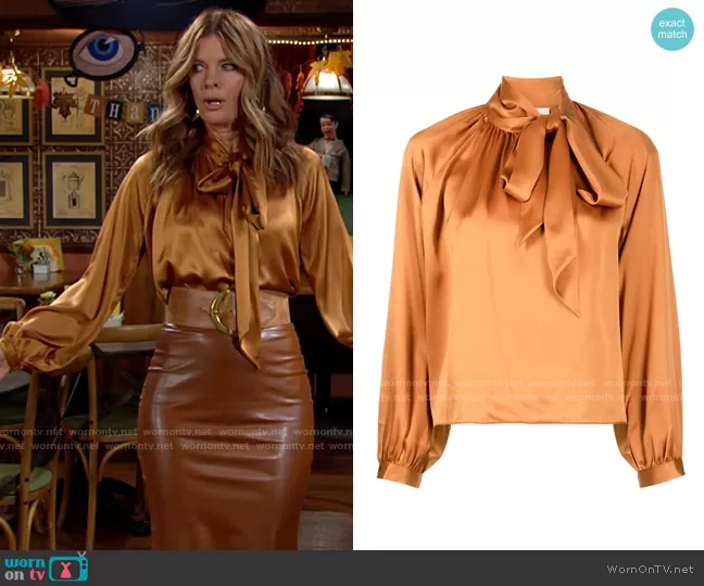 Phyllis Summers (played by Michelle Stafford) on The Young and the Restless on CBS was spotted wearing this orange tie neck blouse on The Young and the Restless on Nov 24 2021's episode. Phyllis's Top is the Pussybow Silk Blouse by Michelle Mason.
