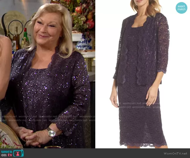 Traci Abbott (played by Beth Maitland) on The Young and the Restless on CBS was spotted wearing this purple embellished lace jacket and dress set on The Young and the Restless on Nov 24 2021's episode. Traci's Set is the Lace Cocktail Dress with Jacket in Eggplant by Alex Evenings.
