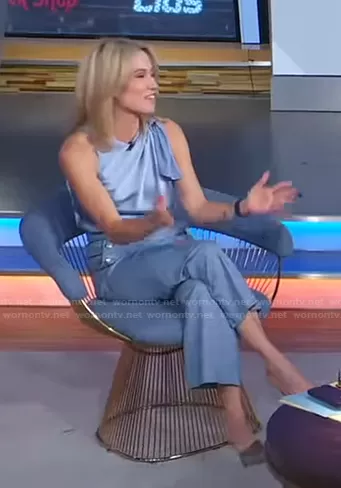 Amy Robach on Good Morning America on ABC was spotted wearing this blue bow shoulder top and check pants on Good Morning America on Nov 23 2021's episode. Amy's Top is the Lindsey Bow Silk Tank by Cinq a Sept . Amy's Pants is the Hunter Cropped Plaid Pants by Veronica Beard.