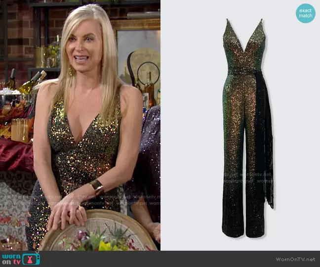 Ashley Abbott (played by Eileen Davidson) on The Young and the Restless on CBS was spotted wearing this sequin jumpsuit on The Young and the Restless on Nov 24 2021's episode. Ashley's Jumpsuit is the Kinsley Jumpsuit by Dress the Population.