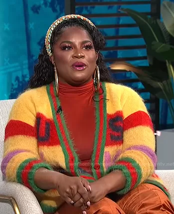 on E! News on E! was spotted wearing this Ester Dean’s yellow printed mohair cardigan on E! News Daily Pop on Dec 03 2021's episode. 's Sweater is the 100 Brushed Mohair Cardigan by Gucci.