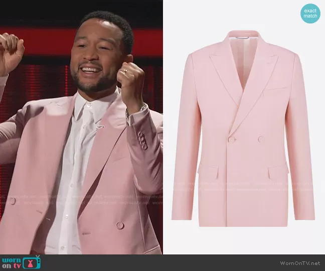 on The Voice on NBC was spotted wearing this pink double breasted blazer on The Voice on Nov 25 2021's episode. 's Jacket is the Double Breasted Jacket by Dior.