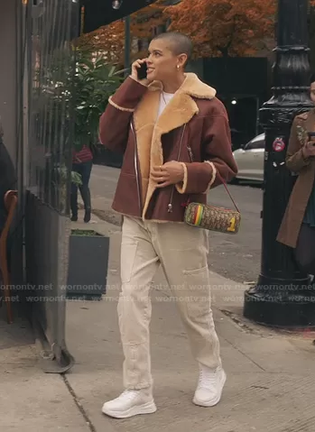 Julien Calloway (played by Jordan Alexander) on Gossip Girl on HBO Max was spotted wearing this brown shearling leather jacket and pochette on Gossip Girl on episode 'Once Upon a Time in the Upper West' (1x07) in Nov 2021. Julien's Jacket is the Zinal Shearling Biker Jacket by Sandro . Julien's Bag is the Rasta Diorissimo Pochette Bag by Dior . Julien's Shoes is the Kyle Leather High-Top Sneakers by Balmain . Julien's Necklace is the J Letter Coin by Maria Black . Julien's Necklace is the Yasmeen Ocean Charm by Maria Black . Julien's Necklace is the Carlo 50 Necklace by Maria Black.