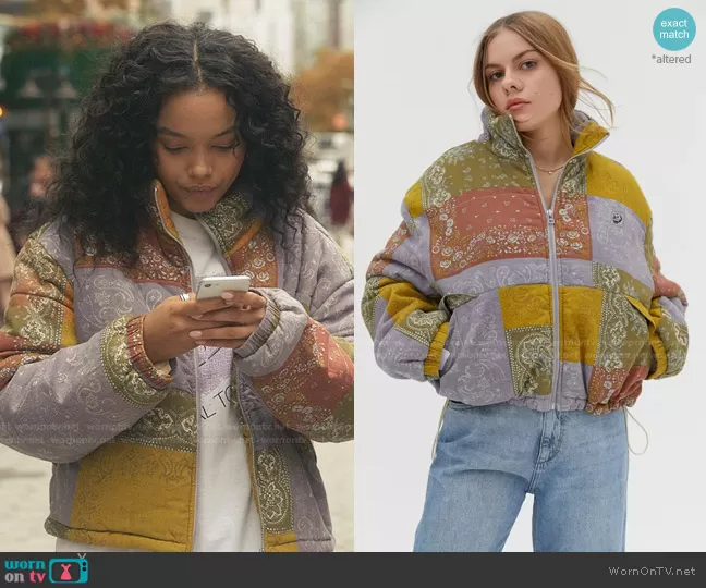 Zoya Lott (played by Whitney Peak) on Gossip Girl on HBO Max was spotted wearing this bandana print jacket on Gossip Girl on episode 'Posts on a Scandal' (1x08) in Nov 2021. Zoya's Jacket is the Ash Printed Linen Puffer Jacket by BDG.