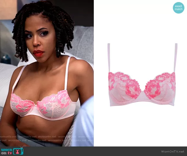 Andrea Barnes (played by Kj Smith) on Tyler Perrys Sistas on BET was spotted wearing this pink lace bra on Tyler Perrys Sistas on episode 'From a Woman' (3x18) in Nov 2021. Andi's Bra is the Floral Lace & Mesh Bra in Whisper Pink by Love, Vera.