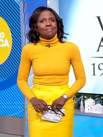 Deborah Roberts on Good Morning America on ABC was spotted wearing this yellow turtleneck sweater and pencil skirt on Good Morning America on Nov 29 2021's episode. Deborah's Sweater is the Alpaca Turtleneck Sweater by Sergio Hudson . Deborah's Skirt is the Leather Pencil Skirt by Sergio Hudson.