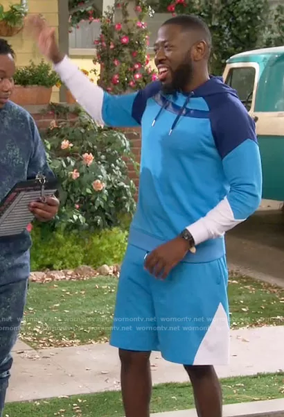 Malcom (played by Sheaun McKinney) on The Neighborhood on CBS was spotted wearing this blue colorblock hoodie and shorts set on The Neighborhood on episode 'Welcome to the Family Business' (4x08) in Nov 2021. Malcolm's Sweatshirt is the Simply Blue Colorblocked Hoodie by Armani Exchange . Malcolm's Shorts is the Simply Blue Colorblocked Shorts by Armani Exchange.