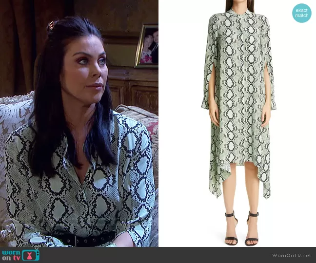 Chloe Lane (played by Nadia Bjorlin) on Days of our Lives on Peacock was spotted wearing this mint green snake print dress on Days of our Lives on Nov 30 2021's episode. Chloe's Dress is the Snakeskin Print Long Sleeve Midi Dress by St John.