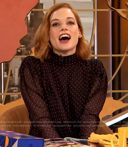 Montana Draped Wrap Polka Dot Dress by Dundas worn by Jane Levy on The Drew Barrymore Show