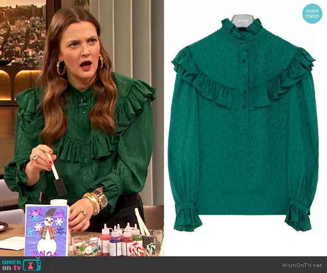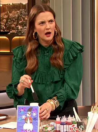 Drew Barrymore on The Drew Barrymore Show on CBS was spotted wearing this green ruffled blouse and plaid pants on The Drew Barrymore Show on Dec 01 2021's episode. Drew's Top is the Ruffled Silk Blouse by Saint Laurent . Drew's Pants is the Black Watch Tartan Stretch Twill Pants by Brooks Brothers.