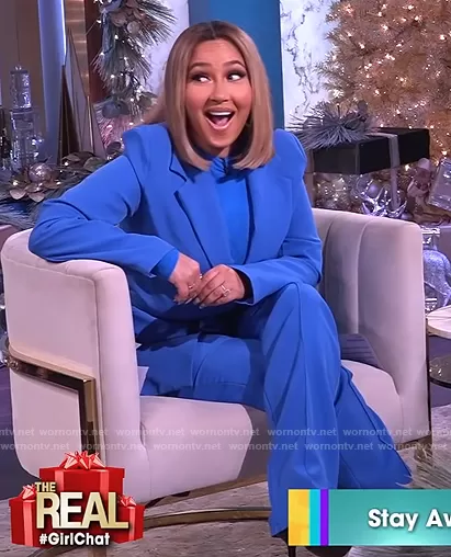 Adrienne Houghton on The Real on BETher was spotted wearing this blue blazer and pants on The Real on Dec 01 2021's episode. Adrienne's Blazer is the Oversized Button Front Blazer by Boohoo . Adrienne's Pants is the Relaxed Paperbag Waist Wide Leg Pants by Boohoo.
