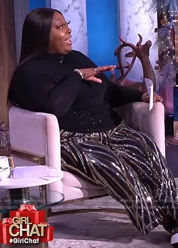 Loni Love on The Real on BETher was spotted wearing this patterned sequin pants on The Real on Dec 01 2021's episode. Loni's Pants is the Wide Leg Multi-Sequin Pant by Eloquii.
