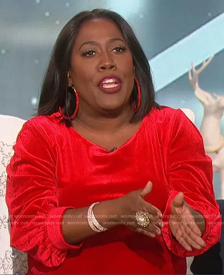 Sheryl Underwood on The Talk on CBS was spotted wearing this red velvet top on The Talk on Dec 01 2021's episode. Sheryl's Top is the Velvet Top by Calvin Klein.