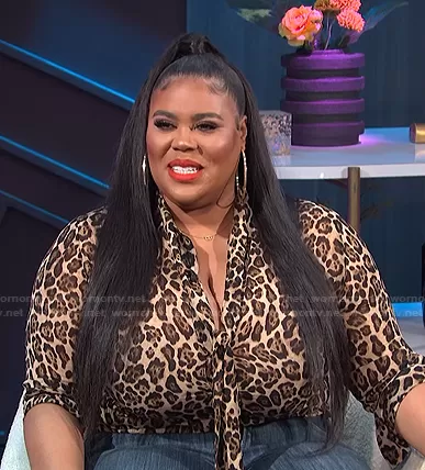 Nina Parker on E! News on E! was spotted wearing this leopard print tie neck blouse on E! News Nightly Pop on Dec 01 2021's episode. Nina's Bodysuit is the Trendy Plus Size Animal-Print Chiffon Tie-Neck Bodysuit by Nina Parker.