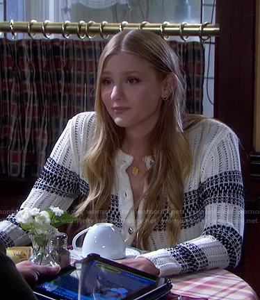 Alice Caroline Horton (played by Lindsay Arnold) on Days of our Lives on Peacock was spotted wearing this white striped knit cardigan on Days of our Lives on Dec 02 2021's episode. Allie's Sweater is the Sarah Stripe Chunky Crop Cardigan by Ramy Brook.