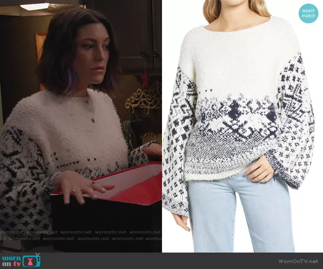 Sarah (played by Caitlin McGee) on Home Economics on ABC was spotted wearing this white printed knit sweater on Home Economics on episode 'Secret Santa Gift' (2x09) in Dec 2021. Sarah's Sweater is the Midnight Beach Rib Off-the-Shoulder Sweater by Free People.
