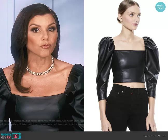 Heather Dubrow on The Real Housewives of Orange County on Bravo was spotted wearing this black leather confessional top on The Real Housewives of Orange County on episode 'Fancy Pants Is Back' (16x01) in Dec 2021. Heather's Top is the Francesca Vegan Leather Top by Alice + Olivia.