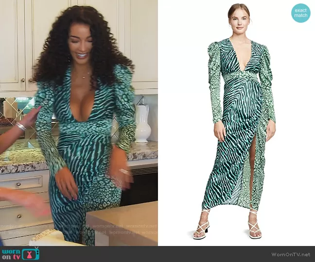 Noella Bergener on The Real Housewives of Orange County on Bravo was spotted wearing this green mixed print plunging dress on The Real Housewives of Orange County on episode 'Fancy Pants Is Back' (16x01) in Dec 2021. Noella's Dress is the Long Dress by Rococo Sand.