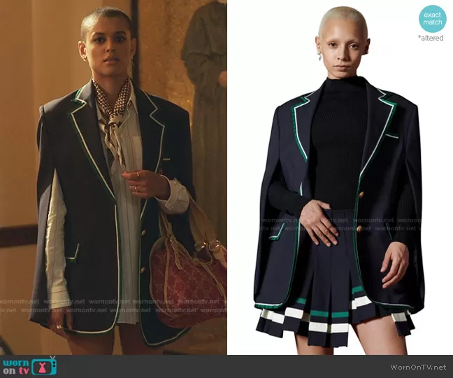 Julien Calloway (played by Jordan Alexander) on Gossip Girl on HBO Max was spotted wearing this navy contrast trim cape blazer on Gossip Girl on episode 'You Can't Take It with Jules' (1x11) in Dec 2021. Julien's Jacket is the Prep School Blazer Cape by Monse.