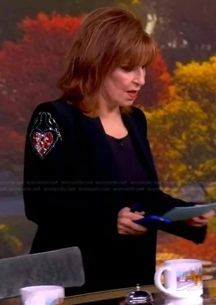 Joy Behar on The View on ABC was spotted wearing this black heart embellished blazer on The View on Oct 15 2025's episode. Joy's Blazer is the Beaded & Embroidered Heart Blazer by Alexander McQueen.