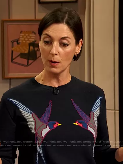 on The Drew Barrymore Show on CBS was spotted wearing this blue bird embroidered sweater on The Drew Barrymore Show on Dec 02 2021's episode. 's Sweater is the Swallow Embroidered Sweater by Stella McCartney.
