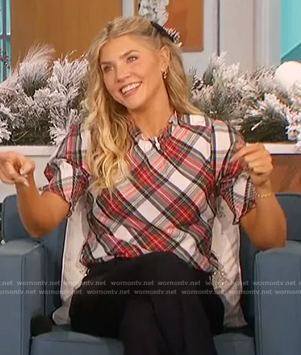 Puff-sleeve top in Snowy Stewart tartan by J. Crew worn by Amanda Kloots on The Talk