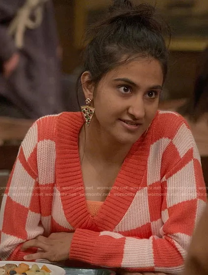 Bela Malhotra (played by Amrit Kaur) on The Sex Lives of College Girls on HBO was spotted wearing this orange checkerboard sweater and pizza earrings on The Sex Lives of College Girls on episode 'I Think I'm a Sex Addict' (1x07) in Dec 2021. Bela's Sweater is the Check V-Neck Crop Sweater by BP . Bela's Earrings is the Pizza Drop Earrings by Baublebar.