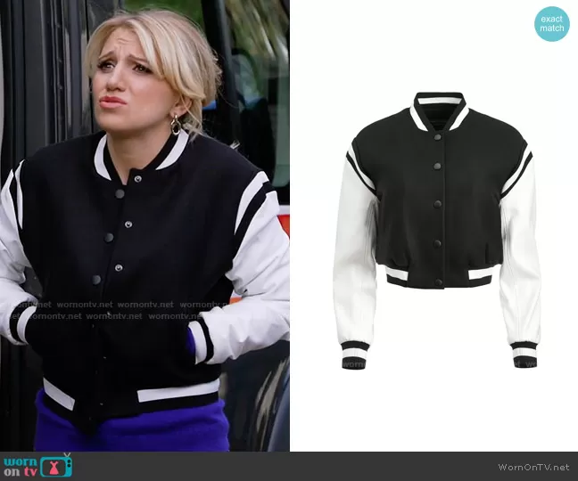 Gina Dabrowski (played by Annaleigh Ashford) on B Positive on CBS was spotted wearing this black and white bomber jacket on B Positive on episode 'A Camper, a Compass and a Cannoli' (2x07) in Dec 2021. Gina's Jacket is the Keri Varsity Jacket by Alice + Olivia.