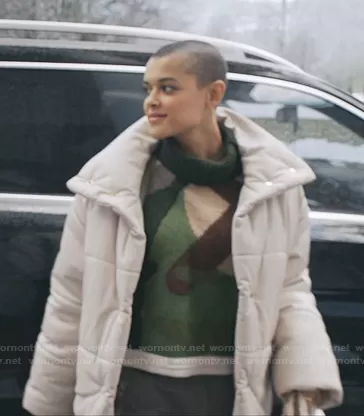 Julien Calloway (played by Jordan Alexander) on Gossip Girl on HBO Max was spotted wearing this abstract print sweater and white puffer jacket on Gossip Girl on episode 'Gossip Gone, Girl' (1x12) in Dec 2021. Julien's Sweater is the Jacquard-Knit Wool Turtleneck Sweater by Sacai x KAWS . Julien's Jacket is the Hide Vegan Leather Puffer Jackey by Nanushka.