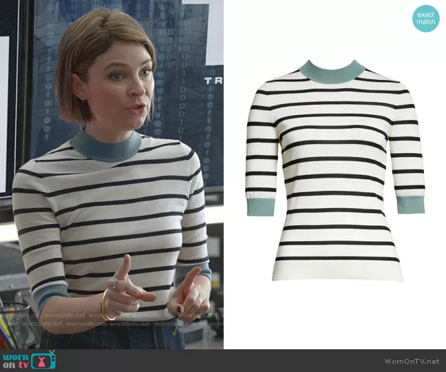Taylor Rentzel (played by MacKenzie Meehan) on Bull on CBS was spotted wearing this white striped short sleeve sweater on Bull on episode 'Confidence Man' (6x07) in Dec 2021. Taylor's Sweater is the Fleia Stripe Ringer Virgin Wool Sweater by Boss.